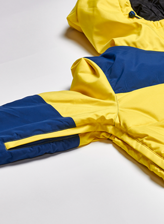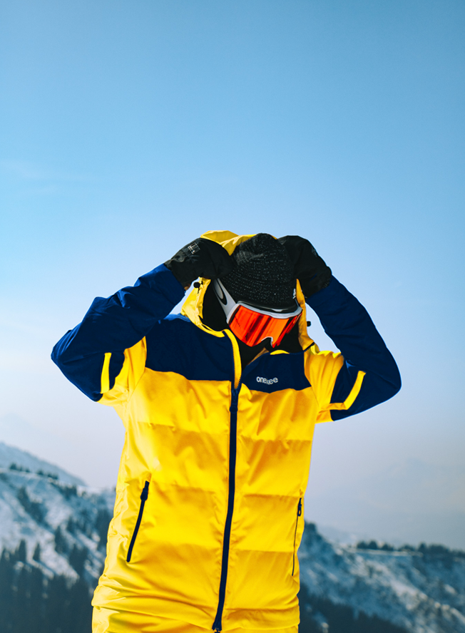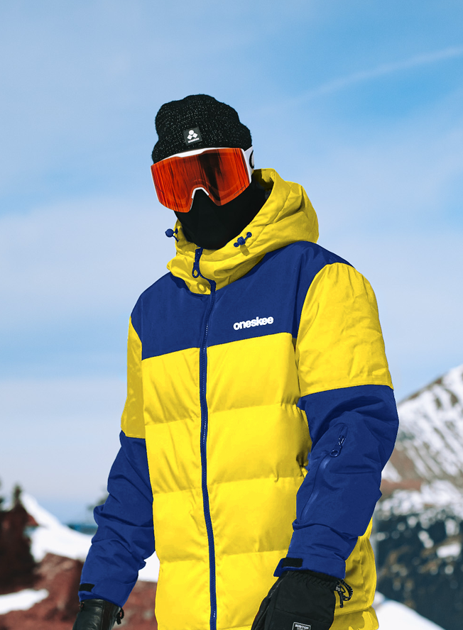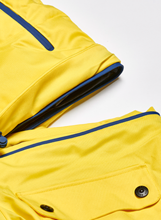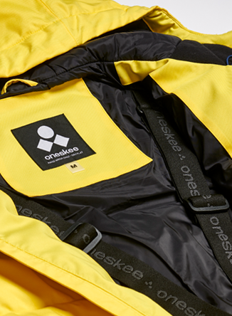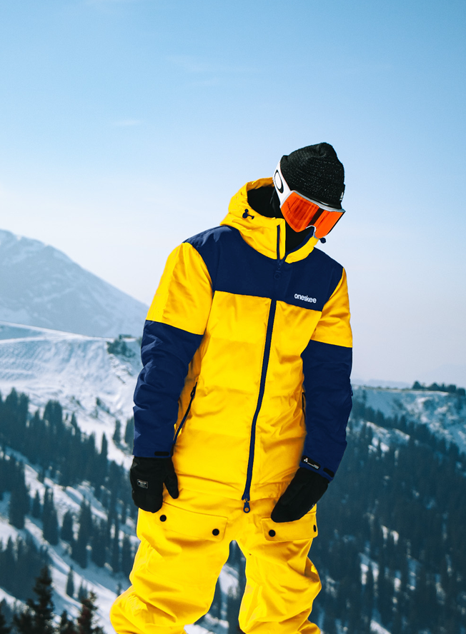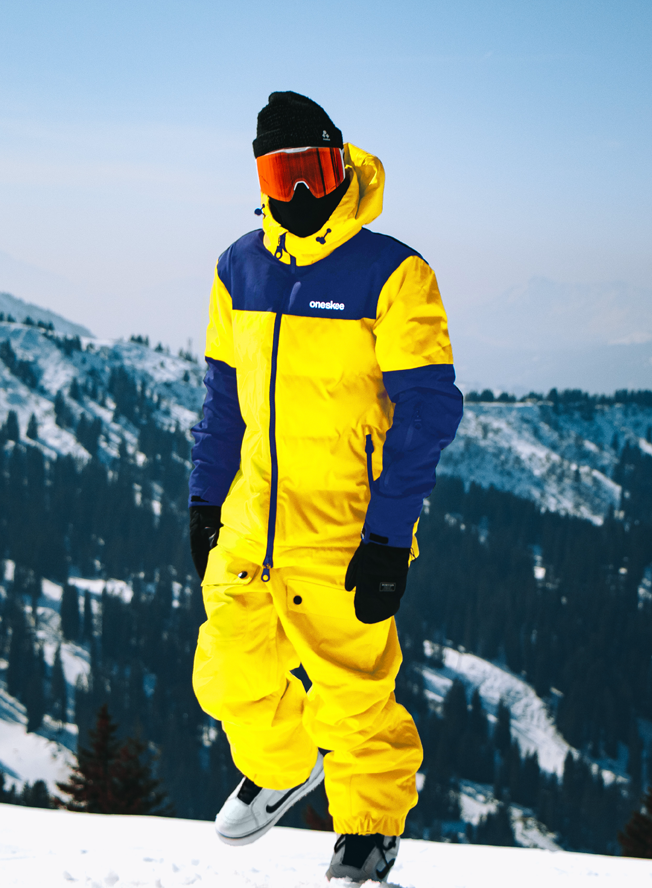 One of our most insulated suits, this vibrant yellow snow suit is a heavyweight Puffer style with contrasting navy panels. It’s part of our 2-in-1 Acclimate™ range which features a 360° zip around the waist that transforms the Oneskee suit into a jacket in seconds, allowing you to use it independently during apres and the milder months. It’s made from our robust SnowSense outer shell fabric and the following technical features: